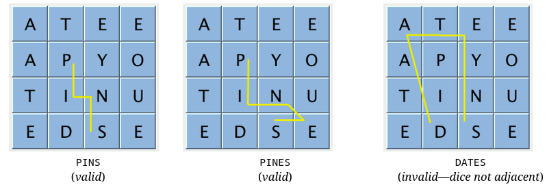 The goal of this assignment was to find all the valid words in a given Boggle board.