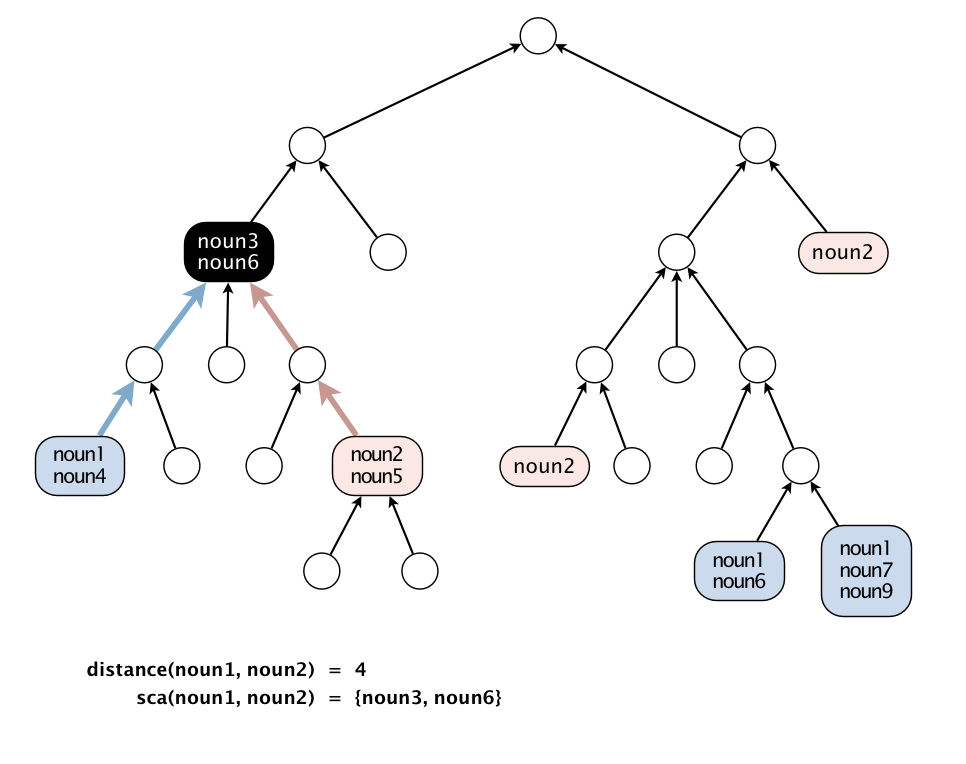 Implementing the first operation was tricky to me at first. I first used 2 isolated depth-first searches for the 2 nouns, using 1 boolean array marked[] to set if a certain index had been traversed. If one of the 2 depth first search instances reach an index which had been marked before, it is taken that a common ancestor had been found.