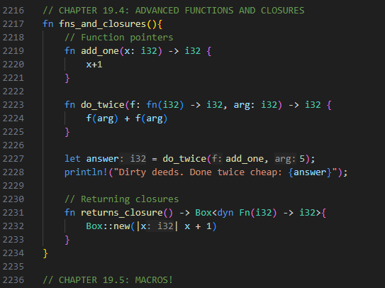 I began my journey of learning Rust through the free online Rust book, that is recommended by the Rust official website. It contains 20 chapters, providing nitty-gritty explanations of every feature of Rust there is. The book is interspersed with code blocks exemplifying the concepts. My personal process of learning was keeping the book open next to vscode. Iād read along, and once I encounter those code blocks I would code-along. The book is great at making you understand the concepts of Rust, but it doesnāt do much to help you internalize it. The book does not contain any quizzes, questions, or assignments (it is a book). At the end of the book, I compiled over 2000 lines of code!