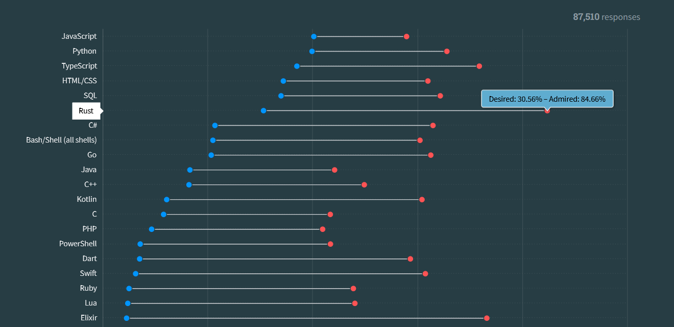 So, why did I go with Rust? Rust has a very clean track record. For 8 YEARS IN A ROW Rust has kept its title of the most admired language by developers, according to Stack Overflow developer surveys. You can see 2023ās results here. Sure, itās not the most sought after by employers - learning Rust wonāt secure your place in a fancy-pantsy job at a FAANG. Oh wait. Whatās that?
