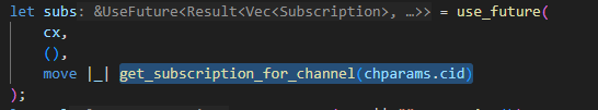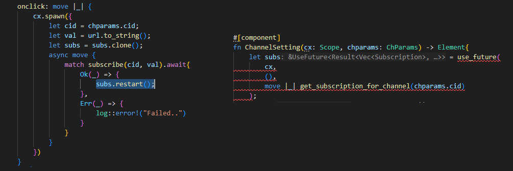 I already implemented the onclick handler fine, and it was able to run my asynchronous function when the item was clicked on. However, when I introduced the subs.restart() call into the on_click closure, the line on the right would error. The error was perplexing: borrowed data escapes outside of function cx escapes the function body. I had no idea why the error would be on that line, or why the data escaped the function. The error was also pointing to a lifeline that was defined in a #[component] macro, code that I couldn’t see or touch. After fumbling arround, trying to find out why, I found an issue on github that was exactly what I had. The issue was closed, with a merged PR, so apparently this was fixed in the latest version of Dioxus. But, when I tried to update my dependencies, I was still getting the issue! So I asked on the thread, and one of the maintainers told me that the code would work out of the box.