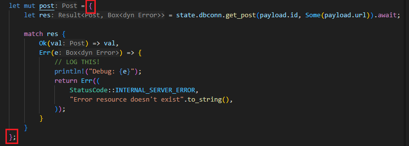 Writing the backend with Axum was delightfully easy. I was applying many of the concepts I had learnt from the Rust book, and solidifying my knowledge on some of the more quirky parts of Rust, like lifelines. I was truly writing Rusty code. Maybe some of the rustiest I’ve written. I was particularly proud of solving this problem below:
