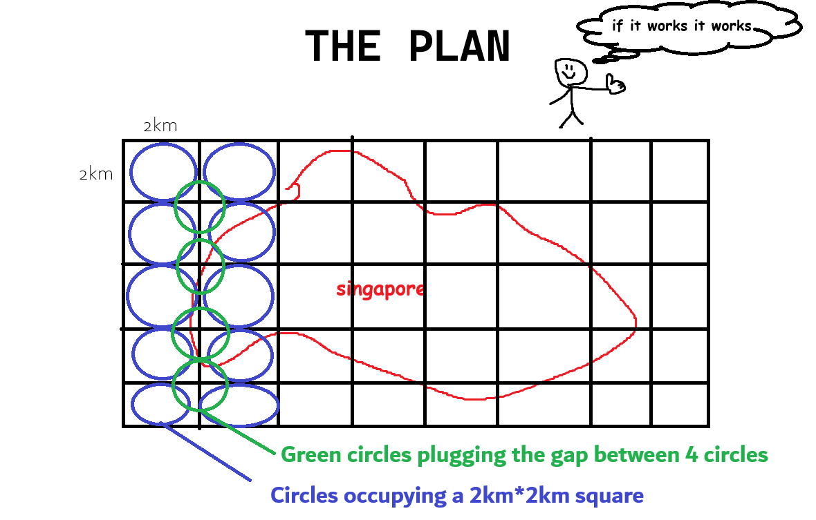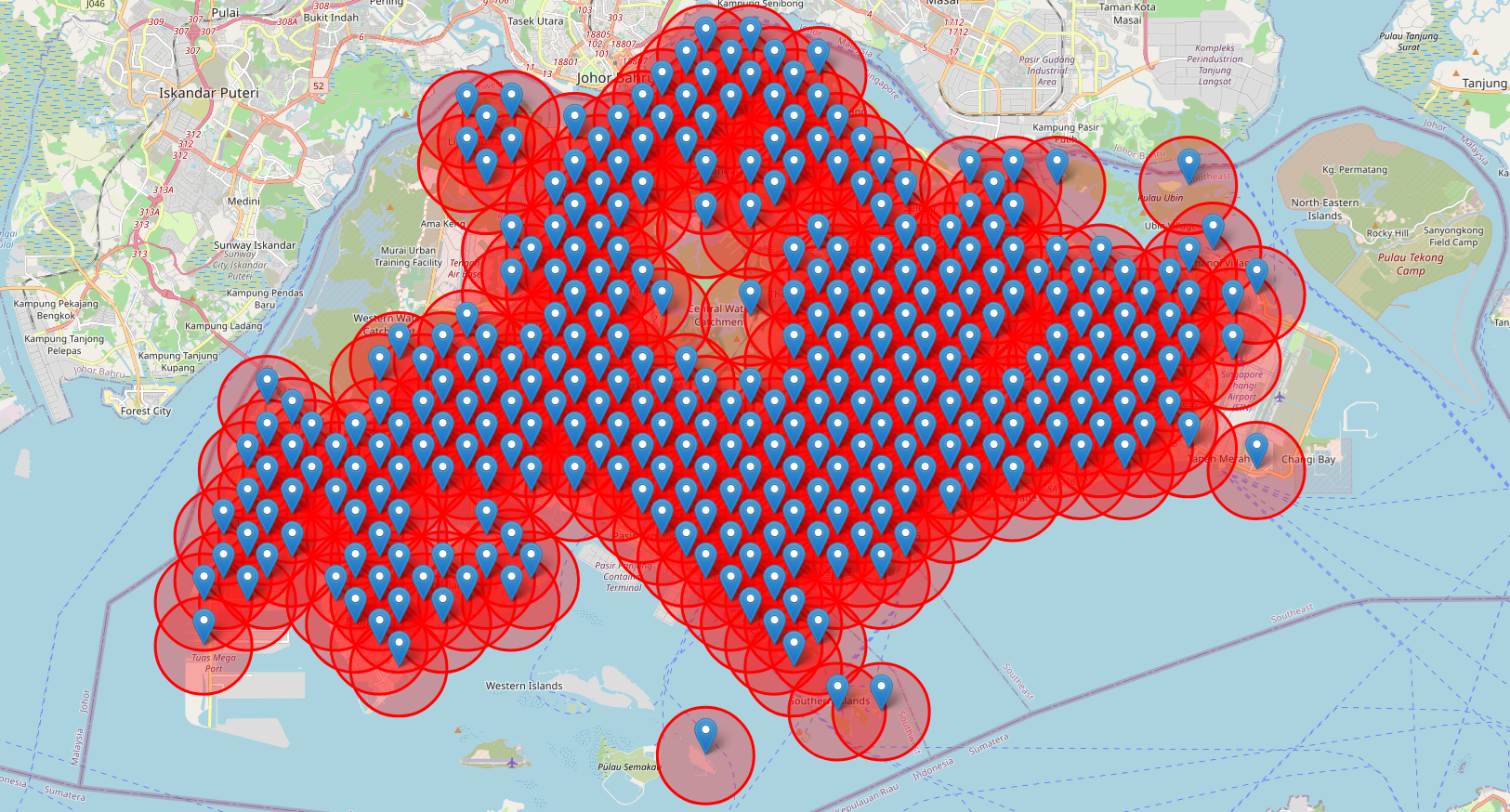 The site takes in an address and returns budget meals in a 2km radius of the query. With this in mind, the job was to simply cover Singapore using circles of 2km radius.