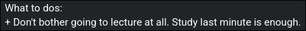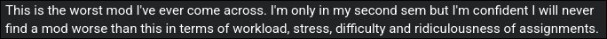 I meant to make this way earlier but it’s the start of y2s1 now but better late than never I guess.Overall thoughts are actually pretty good! This felt way better than sem 1, and I mostly think it’s due to lesser math and more programming-related stuff. Stuff I feel more comfortable with.