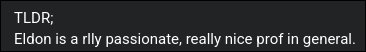 Either way, learned a decent bit from this. Also prof eldon is by far the best lecturer I’ve encountered so far. His enthusiasm is infectious.