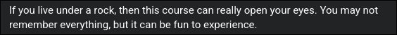 In terms of the non-CS related courses, I really enjoyed this one. In contrast to HSA1000. I enjoyed the structure of the course. The reading material was good too - it made me read some texts I would have probably never read on my own time. Overall entertaining, especially if you like reading! From my experience, most people seemed to not have read the text and instead watched the videos covering the texts. While you can do that, I still think that reading the texts would give you an overall advantage, so I do recommend that if you’re going into this that you prepared to (and look forward to!) read. The texts are not particularly long, aside from 1 or 2 of them.