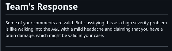 People looooove to hide behind their keyboards huh. You get situations like the ABOVE, where dev teams completely eschew professionality and result to personal attacks. At their own detriment. Well if only I could earn the schadenfreude and see their faces when the teaching team favored my report over their response. If only. I’ll take my overall result as a consolation prize though.