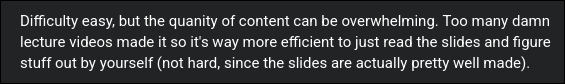 The content is learnable, but the assessments are extremely tedious. At times it feels like they’re throwing everything at you and hoping you make a mistake. And due to the nature of the content, one tiny mistake can cascade and absolutely derail everything later on.