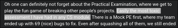Whew, CS2103T. This is the most well-handled module I’ve taken so far. There are certain pain points in the module (cough cough the PE), but every single time I encounter a situation where I’m thinking “That’s so weird why would they do it like this” Prof. Damith will have wrote out why (or talked about it) somewhere and I’d be like “okay that makes sense”. Prof. Damith seems to be acutely aware the trade-offs of conducting assessments in a certain way, and he seems to take the best way forward most if not all of the time.